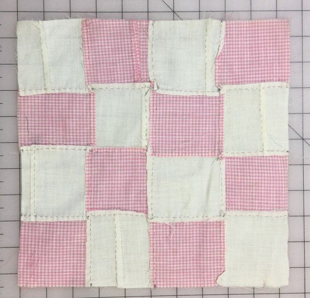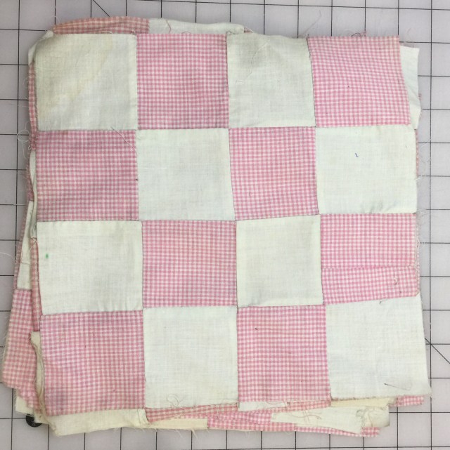 Lot 4 – Sixteen Patch blocks. 14 blocks measuring approximately 10 inches. Some soiling. I think they will clean up just fine, but I would wait until they were finished to wash. Would look great with alternate chambray blocks. $12