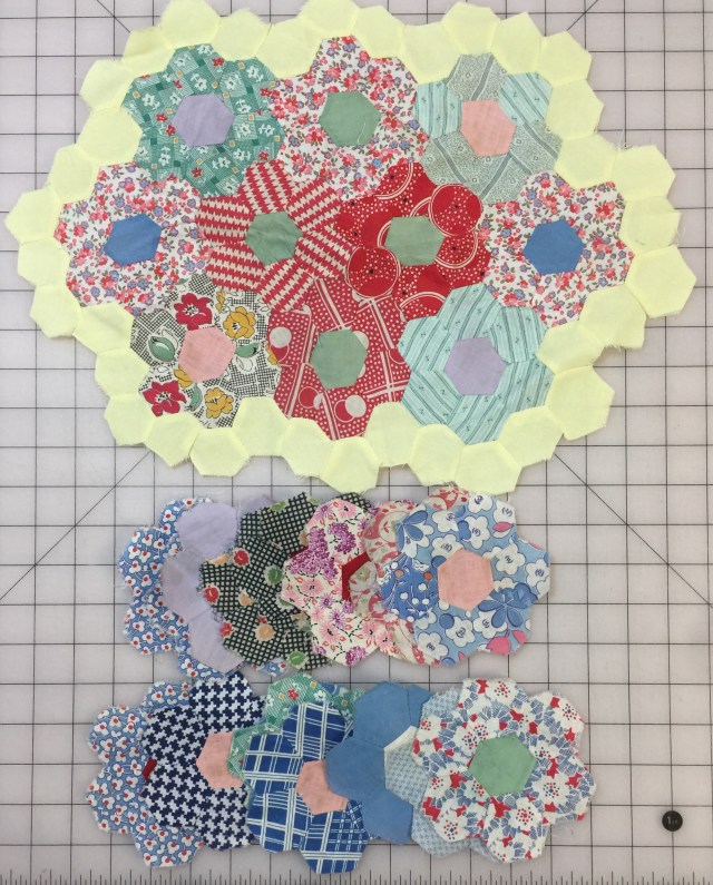 Lot 2 – Fourteen Hexie flowers, plus ten more sewn together with the yellow border. Hexies are one inch finished size. My plan was to take apart the big piece and Appliqué all the flowers onto background squares. 1930-40s. Sold!