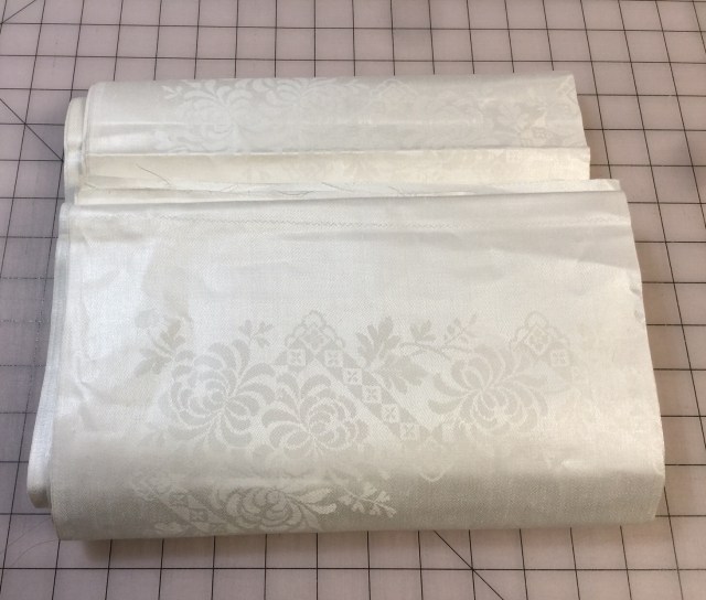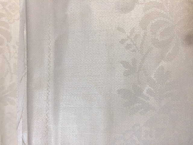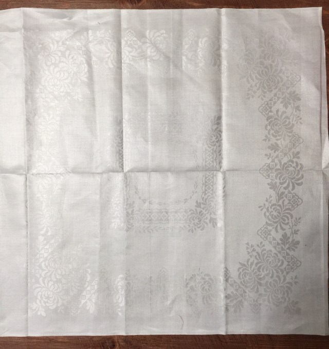 Lot 5 – Damask napkin yardage in one continuous length. Each napkin is approximately 21 inches square. These have been folded for many years so I’m not sure if the creases will come out. No stains or marks that I can see. Six napkins total. I think these would be beautiful quilted up. Sold!