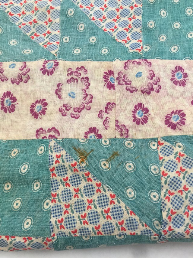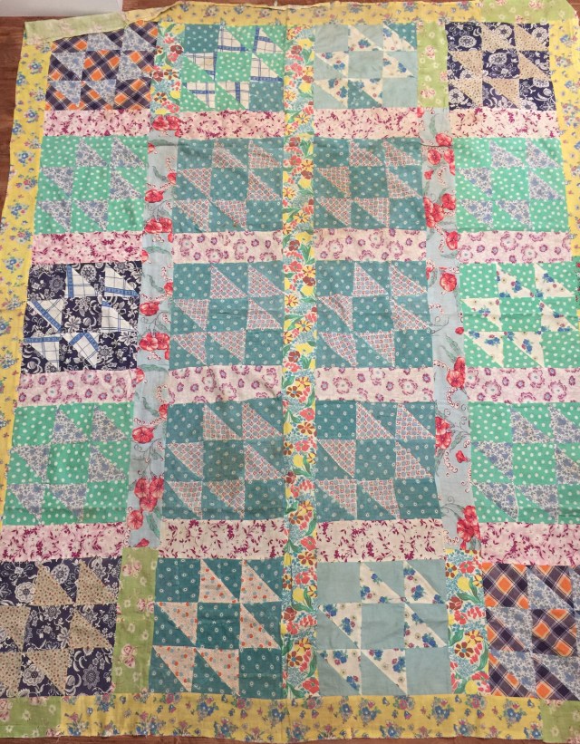 Lot 9 – Vintage Feed Sack Quilt Top. Machine pieced, some staining, a few places where seams need to be resewn. It is thin. Approximately 68 by 83 inches. Sold