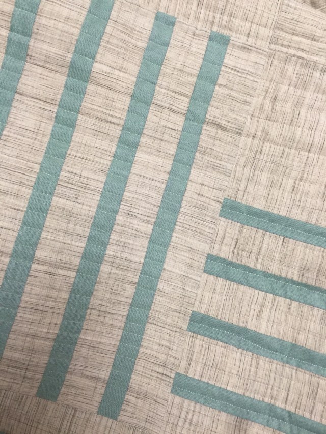 I finally got this top done for Daughter #3. She wanted me to quilt a random grid on it. This is how I do it. I load the top and using my channel lock, I quilt several straight ones across the top. I don’t mark of measure anything.