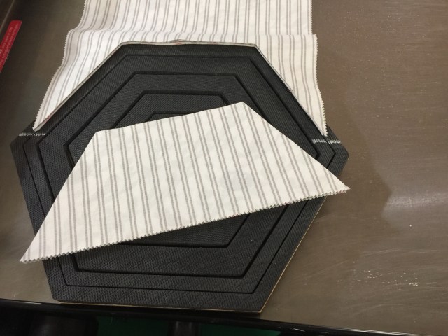 I grabbed my nested Accuquilt hexagon dies and made marks with a silver sharpie 4 inches from the top edge of one. I lined up ten layer cake squares on these marks and ran them through my die cutter.