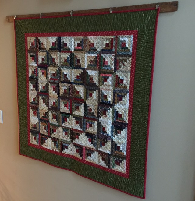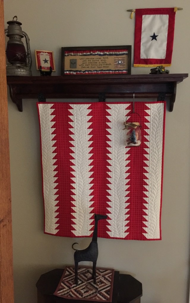 I didn’t put a garland on the bannister this year, so I displayed some red and green quilts.