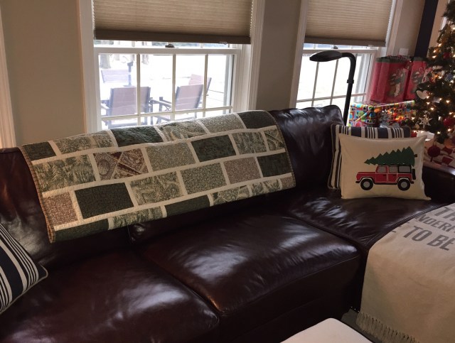 Christmas quilt on the back of the couch, handy for getting cozy.