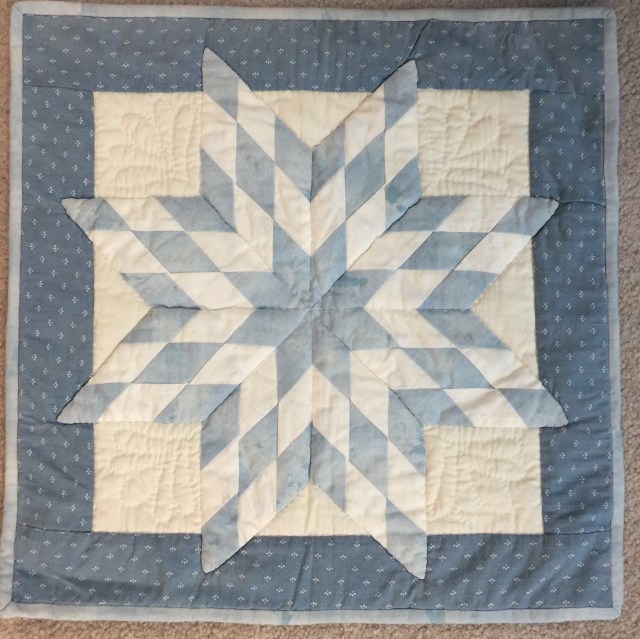 I unearthed some ancient quilts while cleaning closets. I think this one was the second quilt I ever made. It was with leftover poly/cotton pieces from the first. It’s only about 20 inches square.