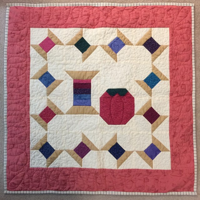 Here’s another very early piece. Somewhere, I had gotten these pieces of decorator fabric samples. Clearly, it could have benefited from more quilting!