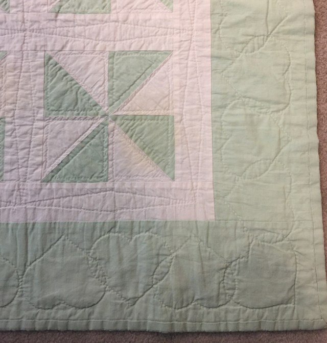I’ve unearthed a few more old quilts. When I first started, I didn’t have a stash. My mom gave me this old green sheet that had belonged to her mother. I used it to make this small baby quilt. I hand quilted it. It was darn near impossible to get a needle through that sheet!