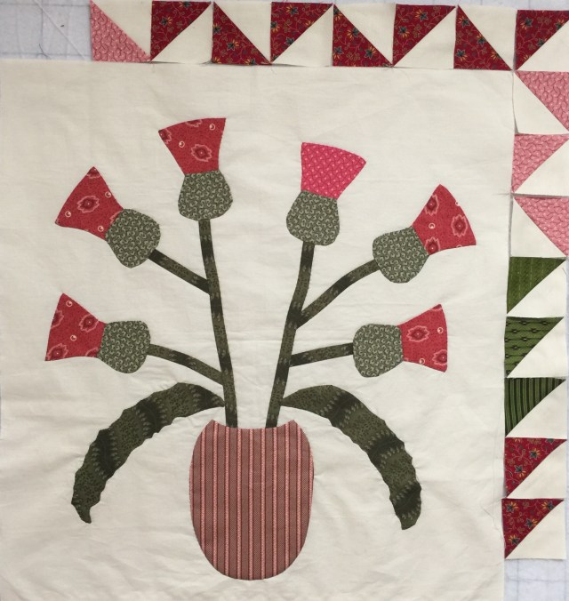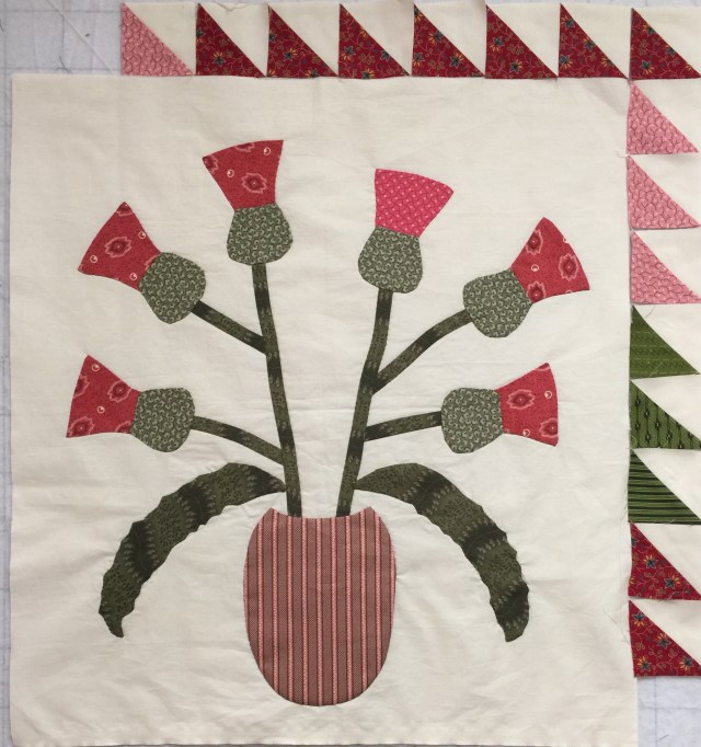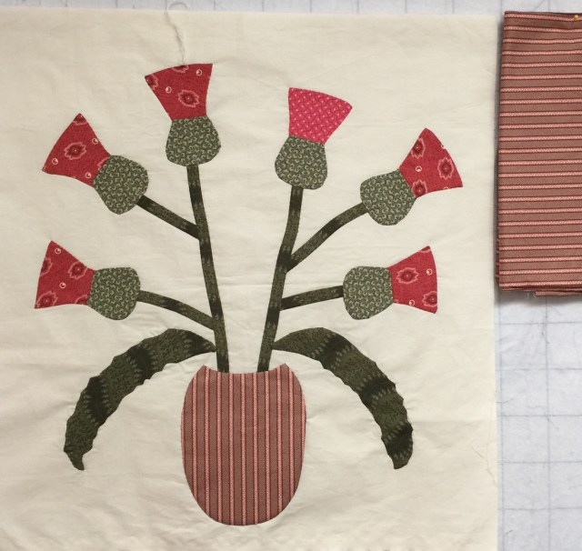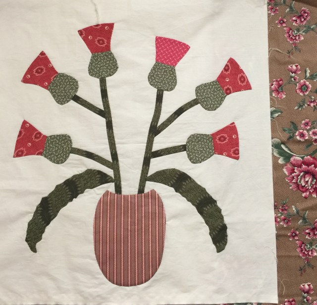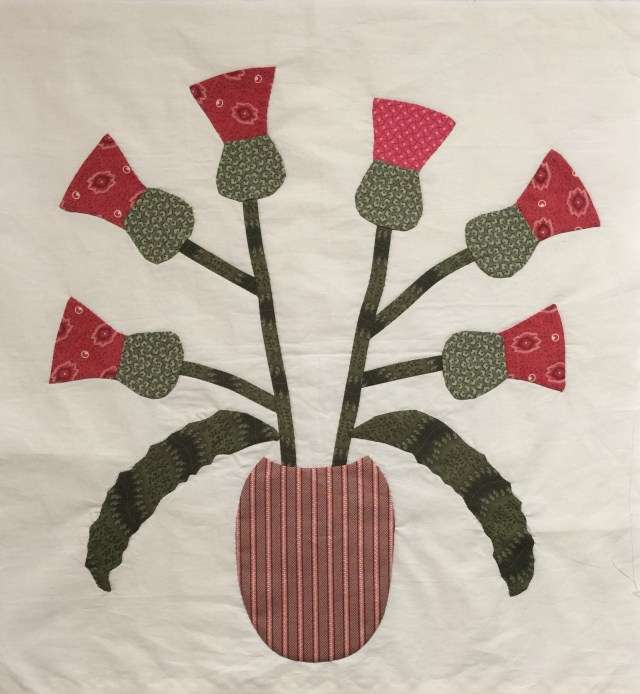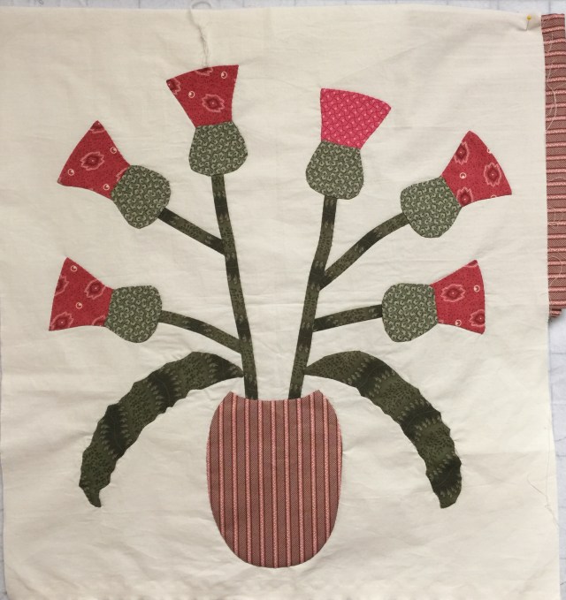 I have the new vase for my thistle quilt done. It is larger than Gwen’s vase, but very similar in shape. I had to make mine bigger because of how I placed my leaves.
