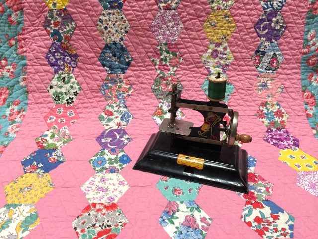 Oh, those fabrics are so sweet! I love this mini and of course always enjoy seeing your little machine as a photo prop. 😀 She’s a sweetie too. I will never forgive myself for not buying one of these at an auction that had a collection of DOZENS of toy sewing machines for sale in every color under the sun. What was I thinking????