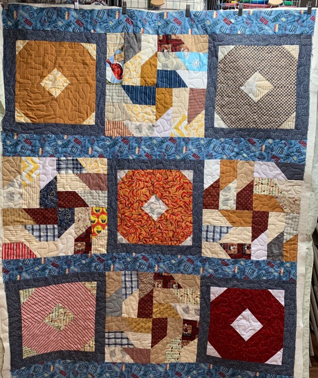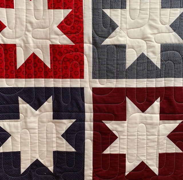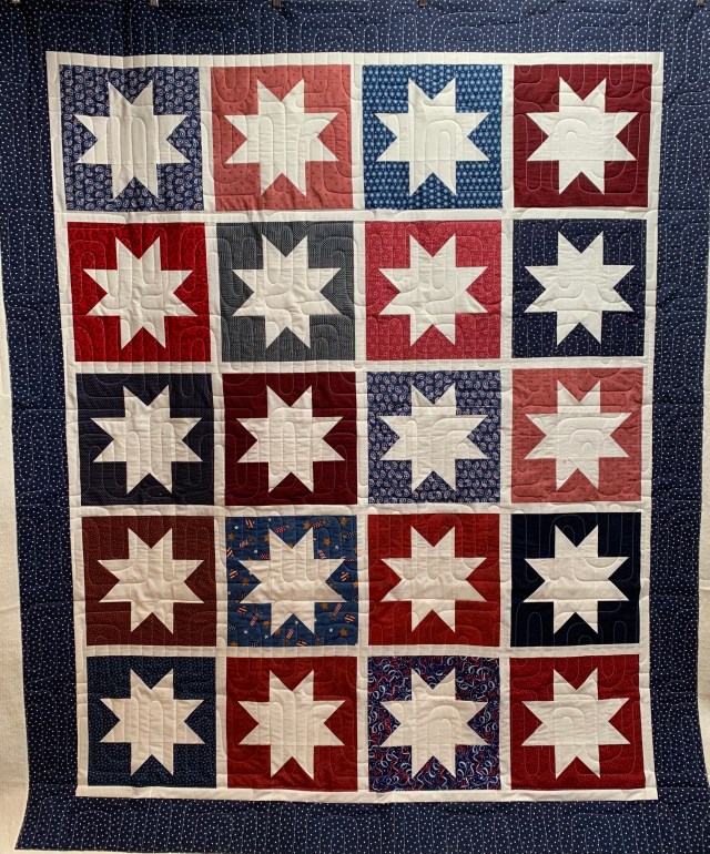 I’ve been working on Quilts of Valor for my Stitching Sisters QOV group this week. As usual, I’m just quilting these and have NO info on patterns. this first top was pieced by Pat.