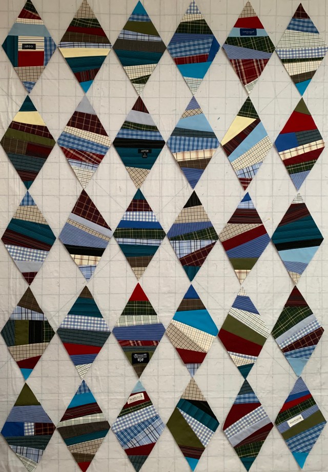 Are you taking part in the String Along hosted by Lori at Humble Quilts? I’m making ten of these diamonds a month out of the scraps left of my dad’s shirts.