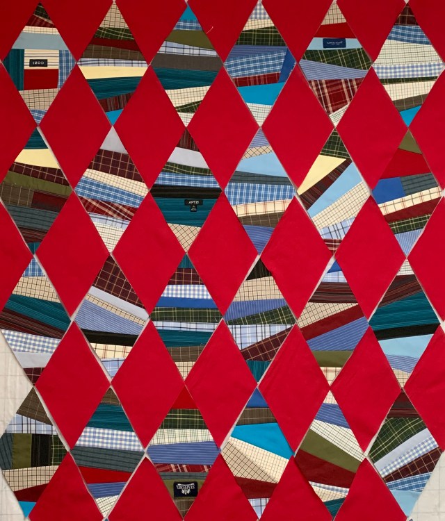 What a great way to use up the scraps from your dad’s shirts! The string diamonds and that red are perfect together!