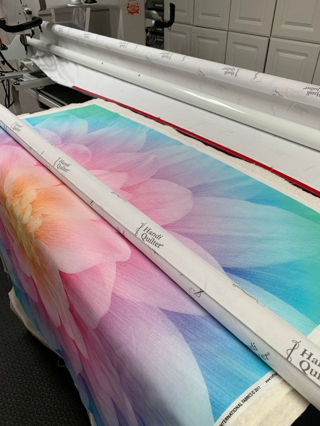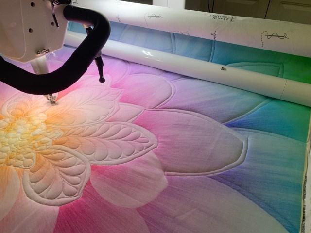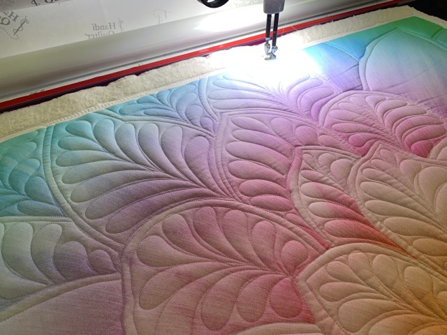 This is the first thing I’ve quilted in over a month and I felt rusty. I used two layers of batting for extra definition. I’m hoping I’ll like it better when it’s done. It is definitely better at a bit of a distance.