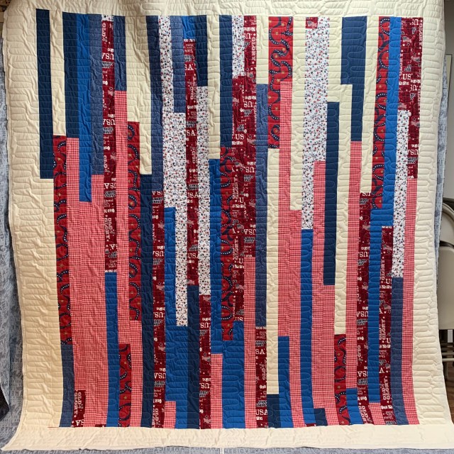 I love the vertical jelly roll race quilt! It gives the quilt a completely different (and interesting) look. The backing is perfect – and I agree with you about the panto.