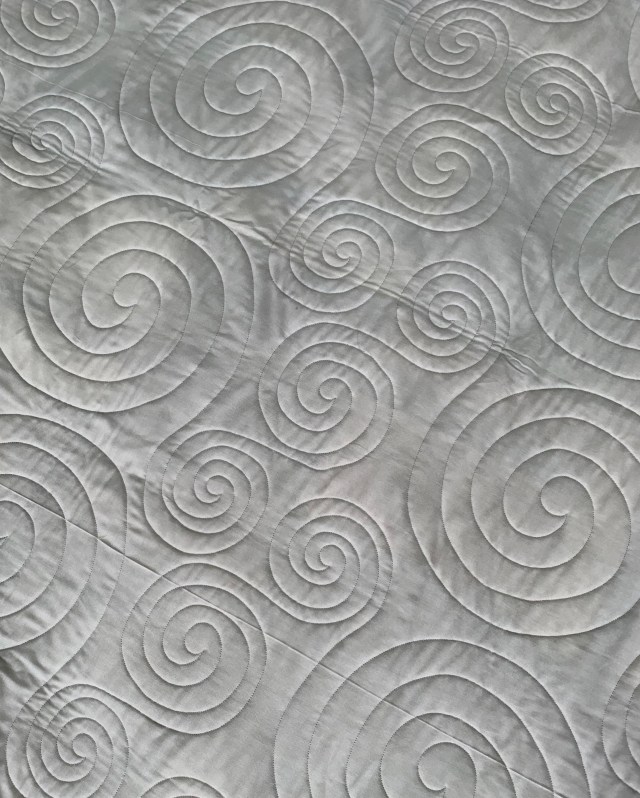 I like the juxtaposition of the straight lines in the blocks and the quilted swirls.