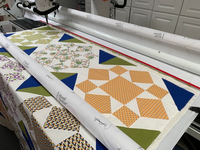 I was thinking about adding borders, but then I found the perfect backing in my stash. If I didn’t add borders, I could use the backing without piecing it. How’s that for logic?