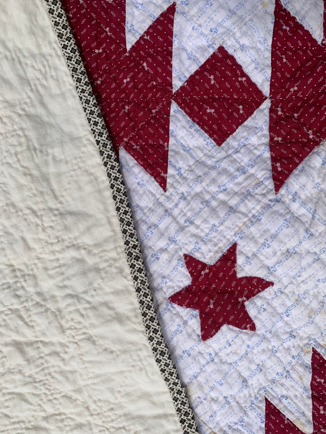 I have no idea when this vintage top was pieced, but I suspect it was somewhere around the turn of the last century. It took me six months to hand quilt.