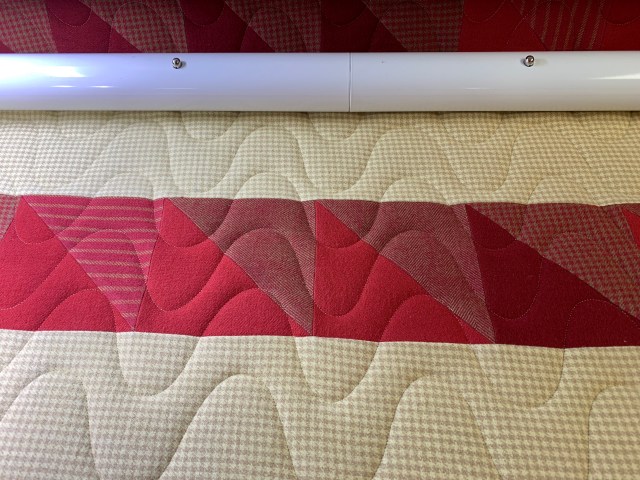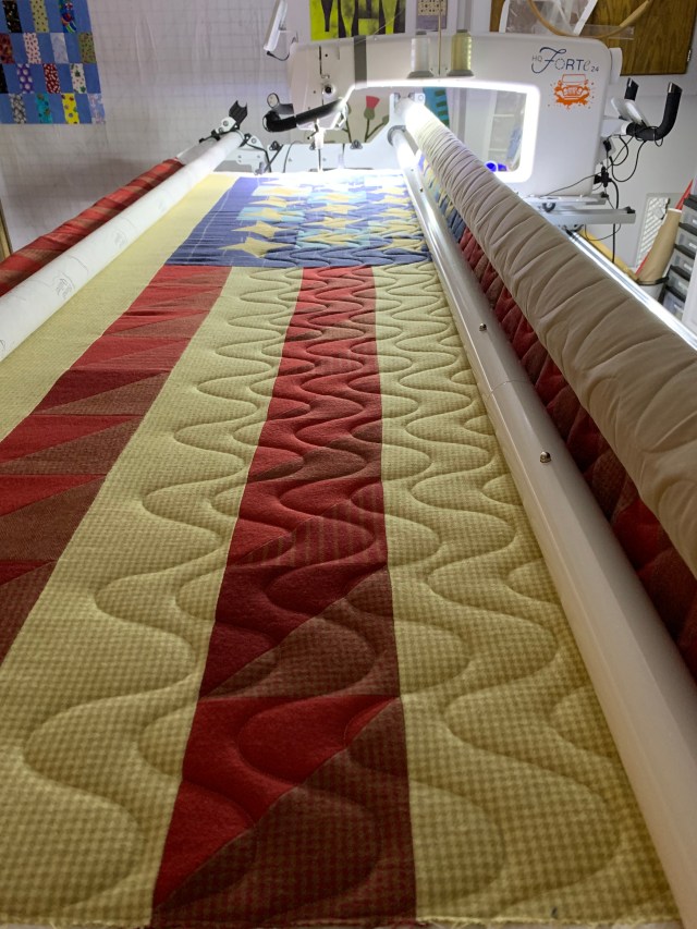 This is the panto I’m using. I’m loving the texture these wovens give when quilted! I’m using Hobbs 80/20 batting and Glide thread in Khaki.