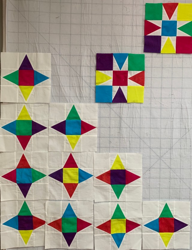 layout #4 is the best- in my opinion. you do great quilting, and you could really fill that negative space… wait, i forgot: you don’t have any more of that white… hmm… does complicate it a bit. but- if you used something light, you could do some star “outline” stitching in the negative space. taht could be interesting.