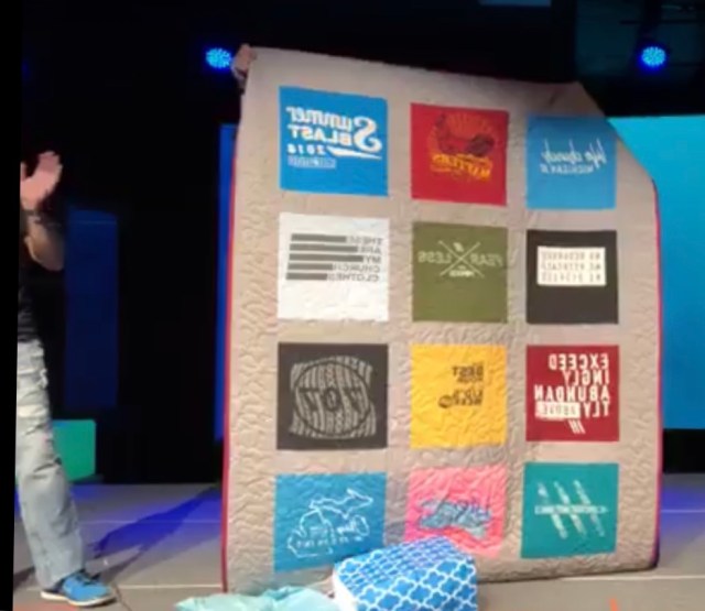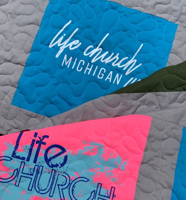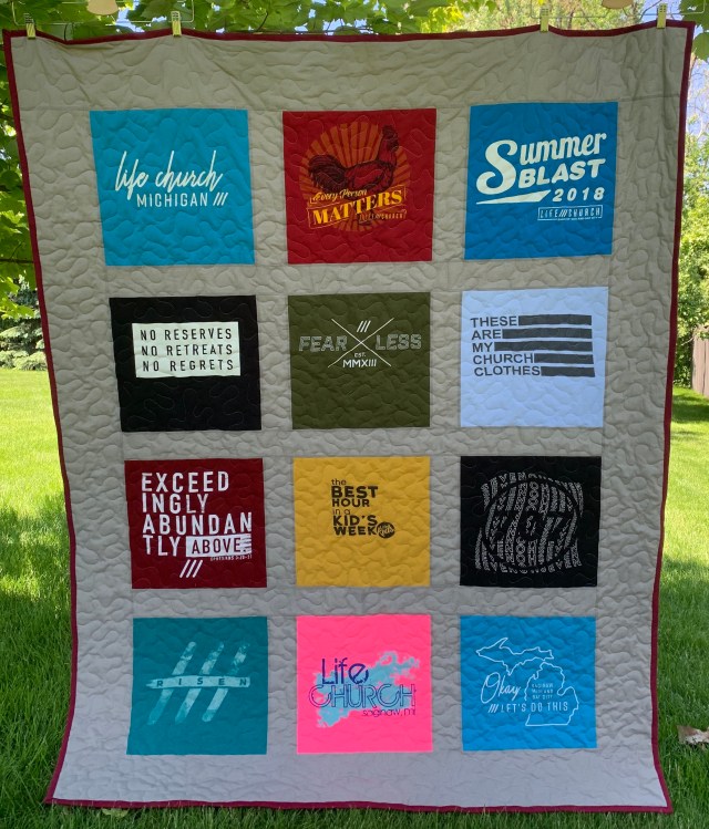 So I made this quilt as a going away gift. At our church, if you are serving in any area on a Sunday, you wear a Lifechurch t- shirt. It helps identify at a glance to our visitors who is a vetted church worker. We get new shirts a couple times a year at least. So I gathered some shirts and made a quilt!