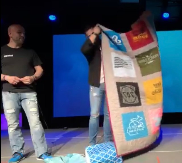 What a nice gift. A t-shirt quilt is a labor of love;).