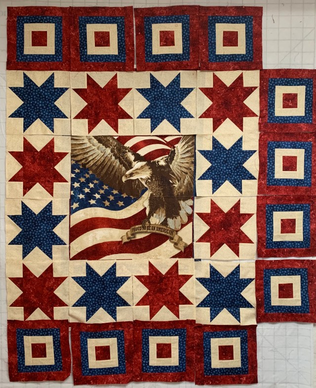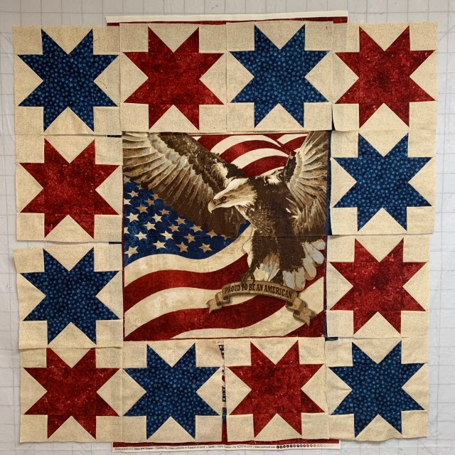I have several people I’d like to present Quilts of Valor to this fall. I have one done, but need to get going on two more. I had leftover blocks from the mystery quilt that I participated in last fall and they match this panel.