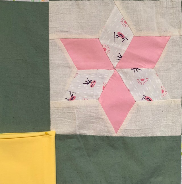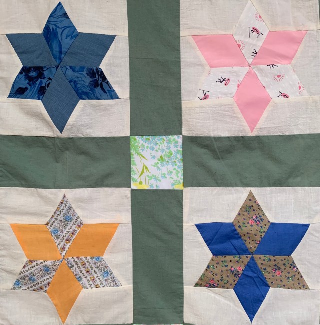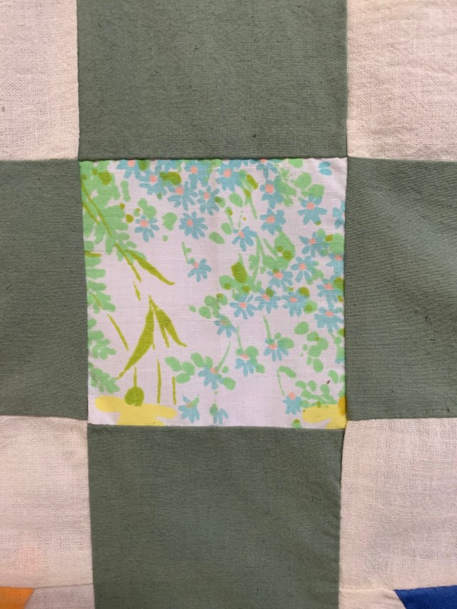 I think you’ve got the right idea, maybe applique something else on top (on point like Audrey said would be really cool). But, sometimes I find that even when there’s a slightly “off” or oddball choice in a quilt, when it is all quilted and finished, the effect is muted and can be quite charming after all.