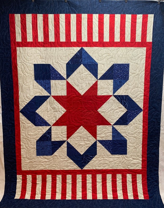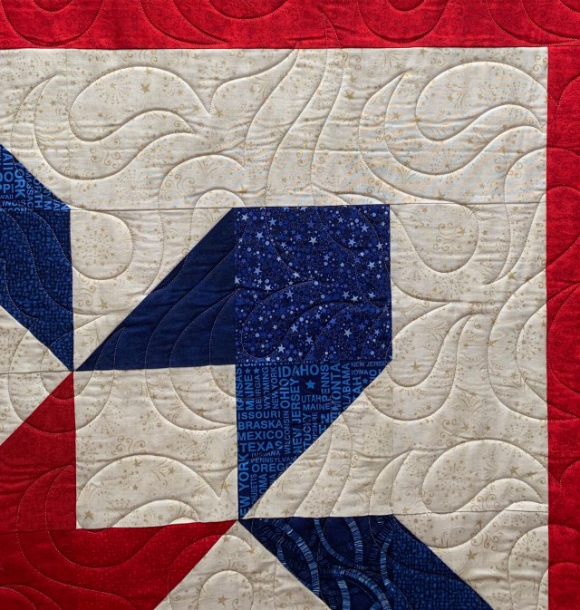 Your quilting looks wonderful on this QOV, Katy. Thank you so much. The quilt pattern is called Fireworks Star for Patriots, and it’s free on QuiltJubilee.com