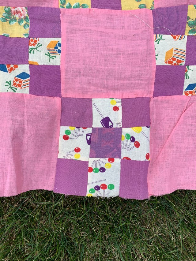 What a pretty quilt, with that lively pink and those fun nine patches! I see Pillsbury printed on one purple square, and partial letters for Minneapolis. How fun is that?! It will be fun to see how you finish this one!