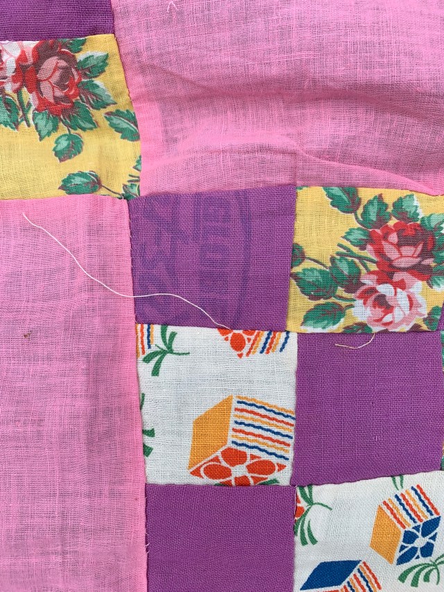 I found this at the same antique mall as the little quilt I shared on Monday. This vintage top came with a poly batting zigzagged to the top and no backing of quilting.