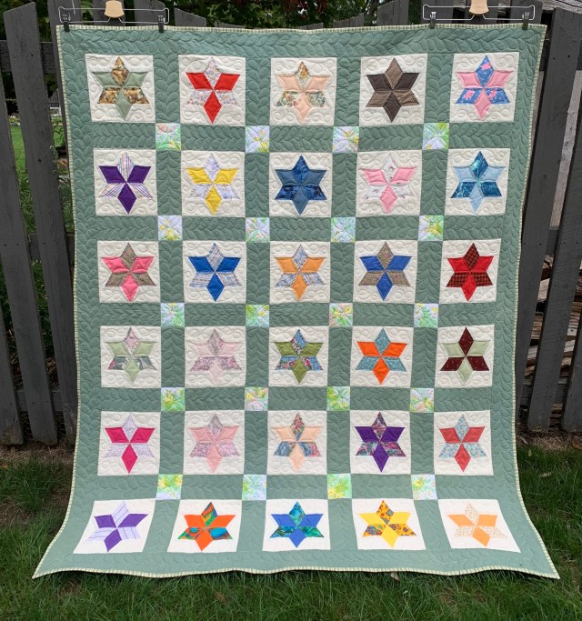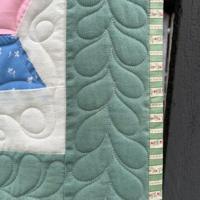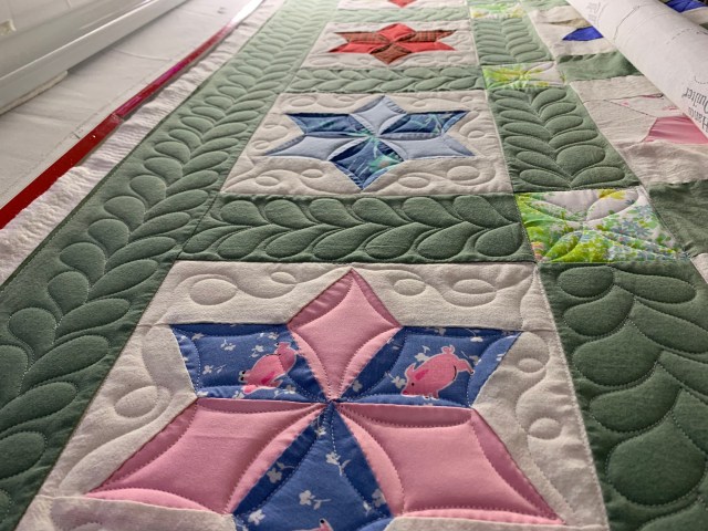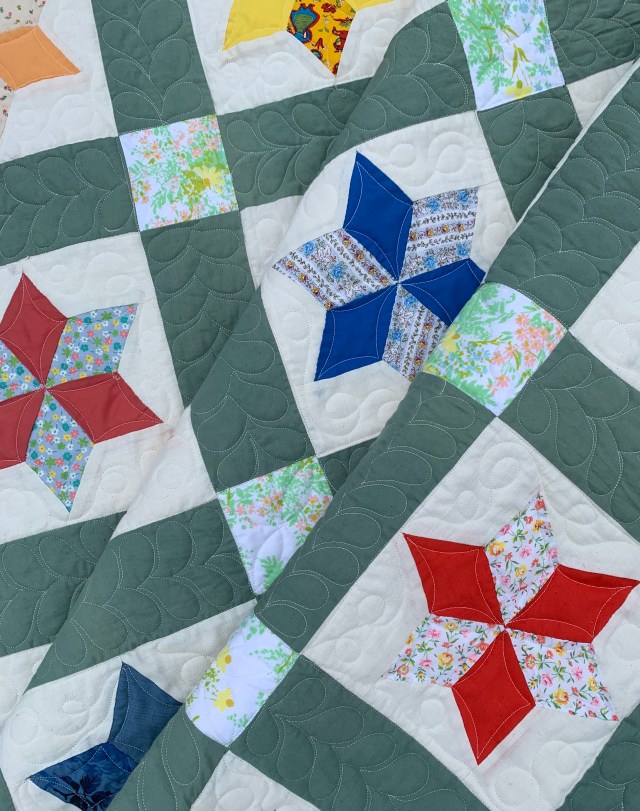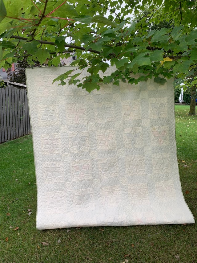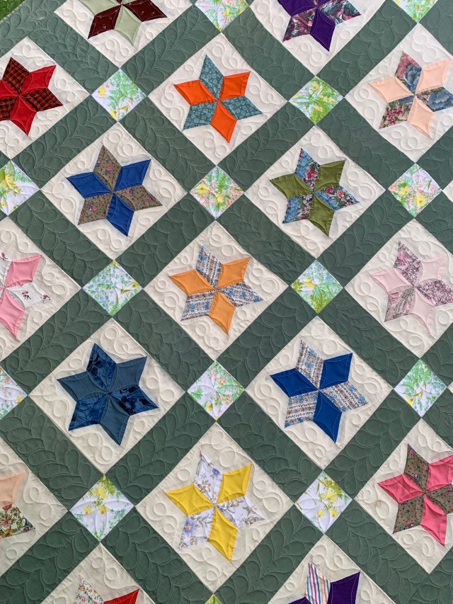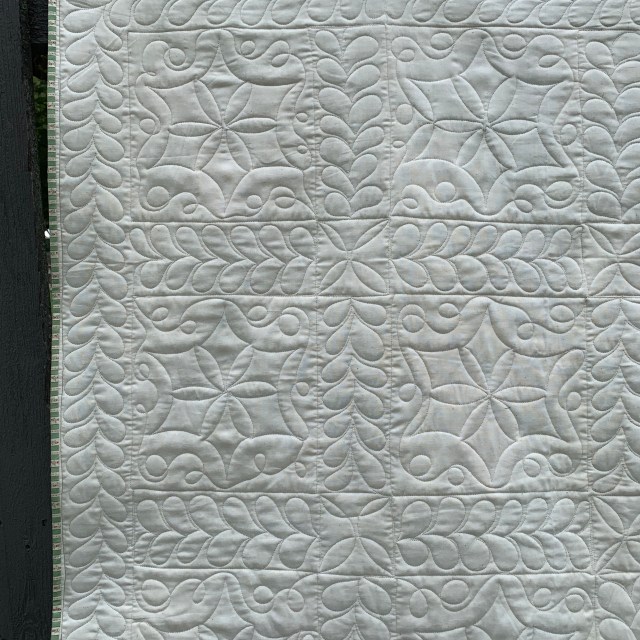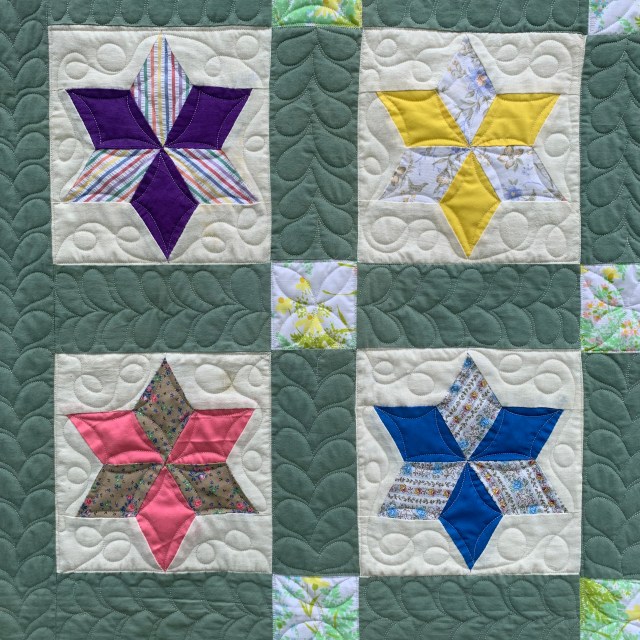 Lovely custom quilting; which softened the bright cornerstones. I think it’s a beautiful quilt. Great rescue!
