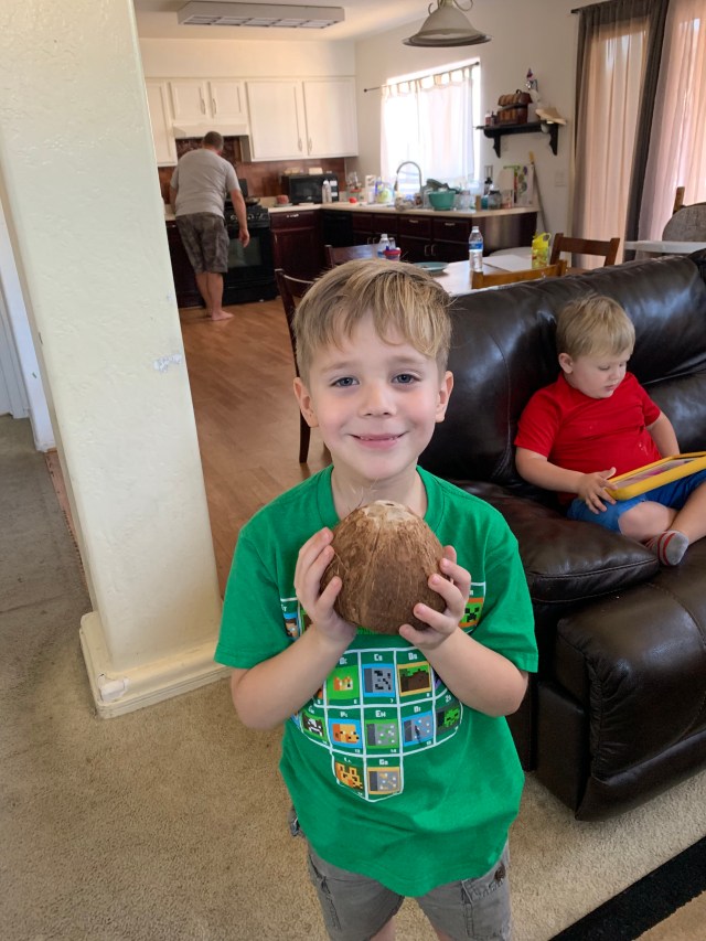 Big L is quite interested in coconut trees, so we bought a coconut so he could see it in real life. He bravely tasted the milk and coconut. We very carefully used a hack saw to cut it open so he could use the shell for a drinking glass.