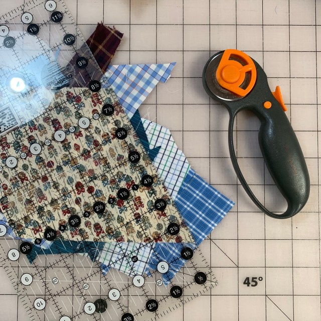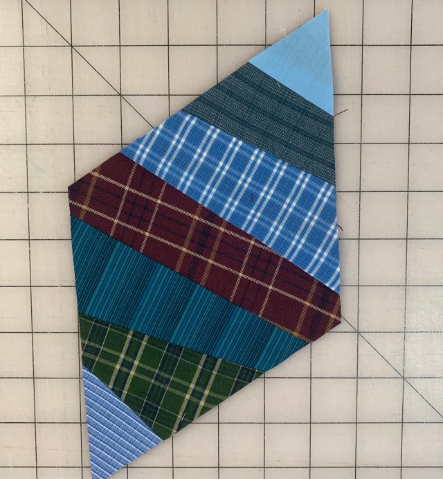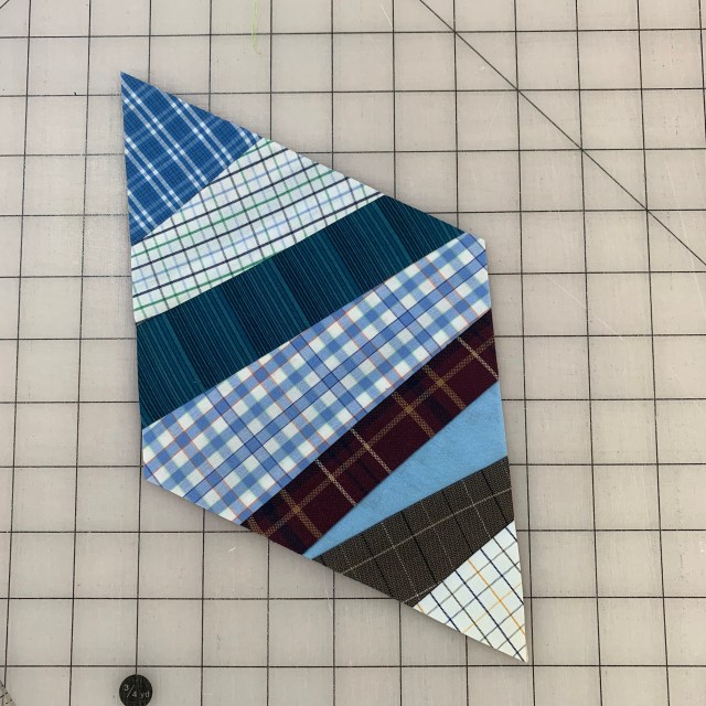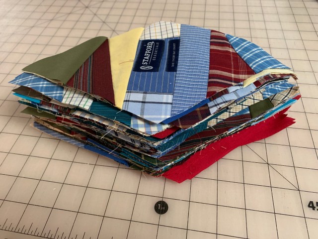 I use “ugly” fabrics as my foundation and flip and sew strings from my dad’s shirts onto the foundation.