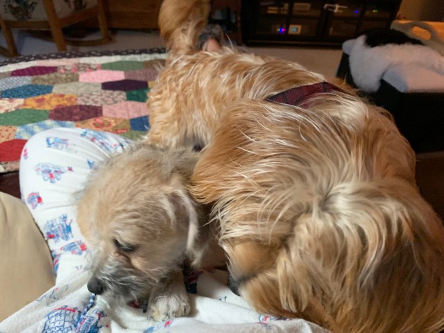 Lola (Daughter #1’s dog and Winslow’s littermate) came over yesterday to check out the new arrival.