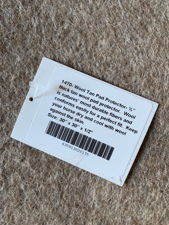 I’ve considered buying one, but they are a bit pricy. Then someone I follow on IG suggested buying a saddle pad for a horse. They are the exact same material, half inch thick and 100%wool. Hmmm…. I did a bit of research and bought one from State Line Tack.