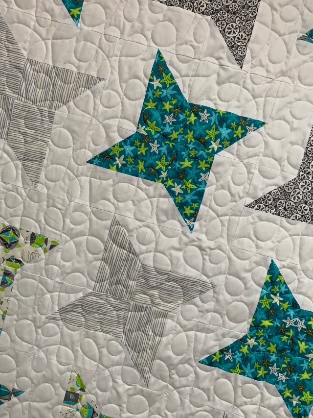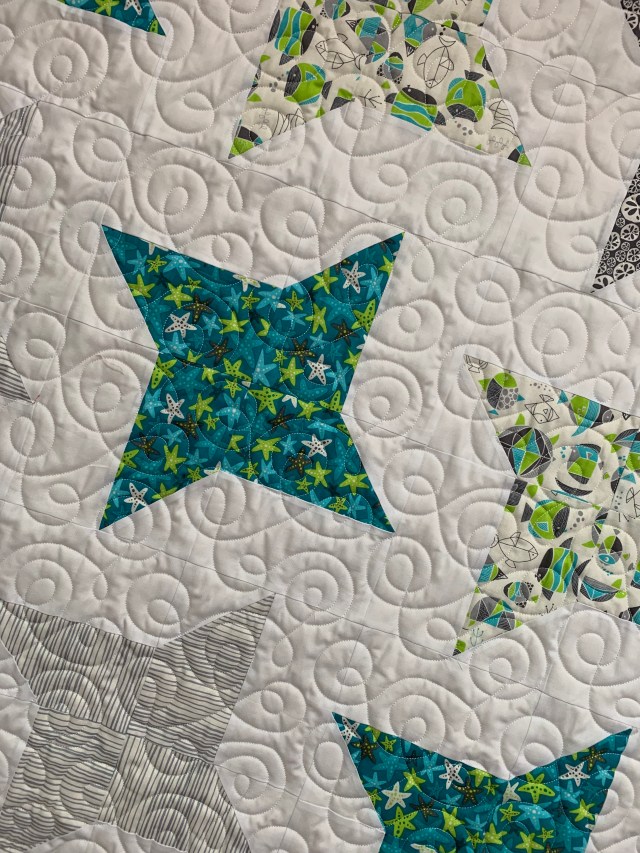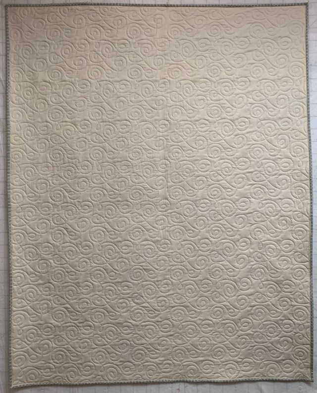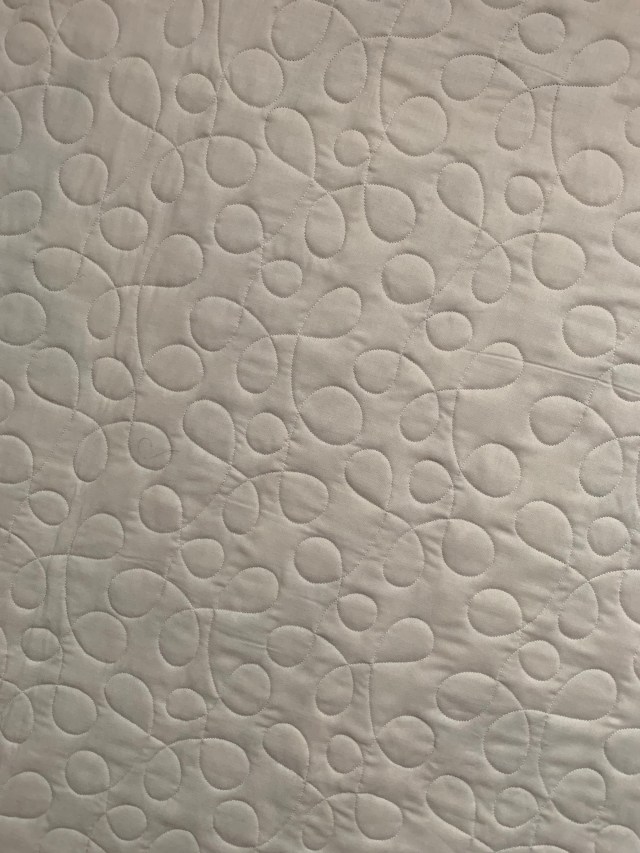 I used two different pantographs and two different battings. The one above is Pellon Legacy 80/20. The one below is Mountain Mist 80/20. The Pellon is beefier and I like it, but my last roll had oil spots here and there. That means trimming out the spots and basting in batting patches. So when I found a good deal on the Mountain Mist for Prime day, I decided to try it. It feels more like Hobbs 80/20. At this point, the jury is still out. I’ll let you know later on how I feel about it.