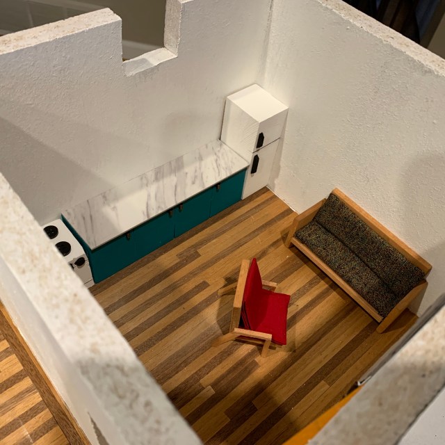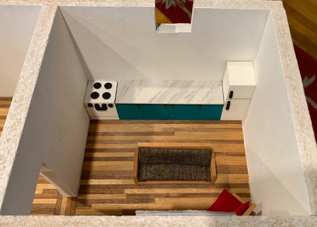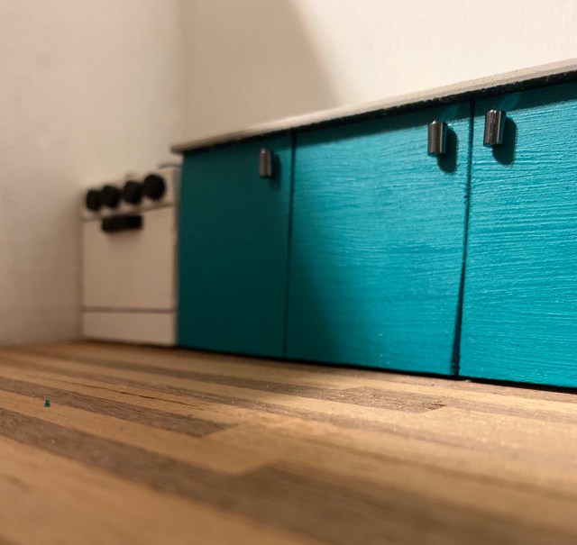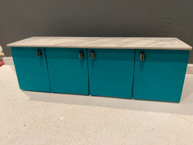 I planned to do a wooden countertop, but I ran across this scrap of vinyl tile that I used on the big house. It made for a perfect marble top instead. The handles are made from beads. I still need to figure out a sink.