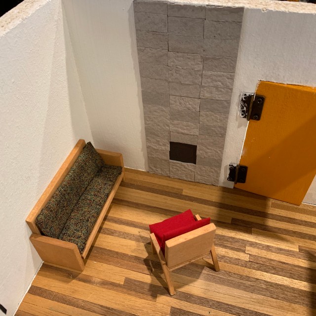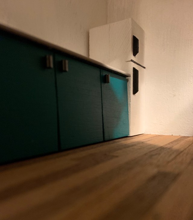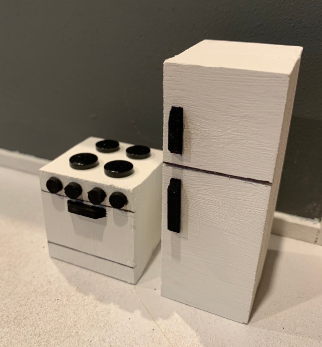I’ve been working on the kitchen! First up, appliances. I created these from solid blocks of wood. I sawed grooves to look like the edges of the doors. I used buttons for stove burners, and I cut the pull handles out of wood. The knobs on the stove are slices of dowel.