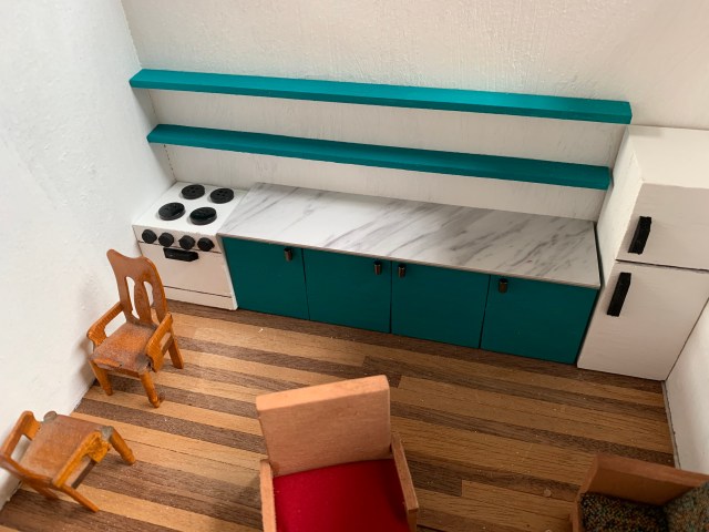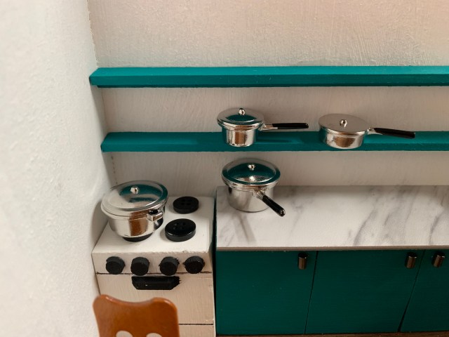 I added shelves to my little kitchen instead of upper cabinets. I think I should have hung them lower.