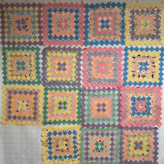 They are stunningly gorgeous. But I can see why they didn’t make it past the block stage. There are slight variations in block size. Trimmed square, they would range from 12-14 inches. I need to figure out how to contend with that.