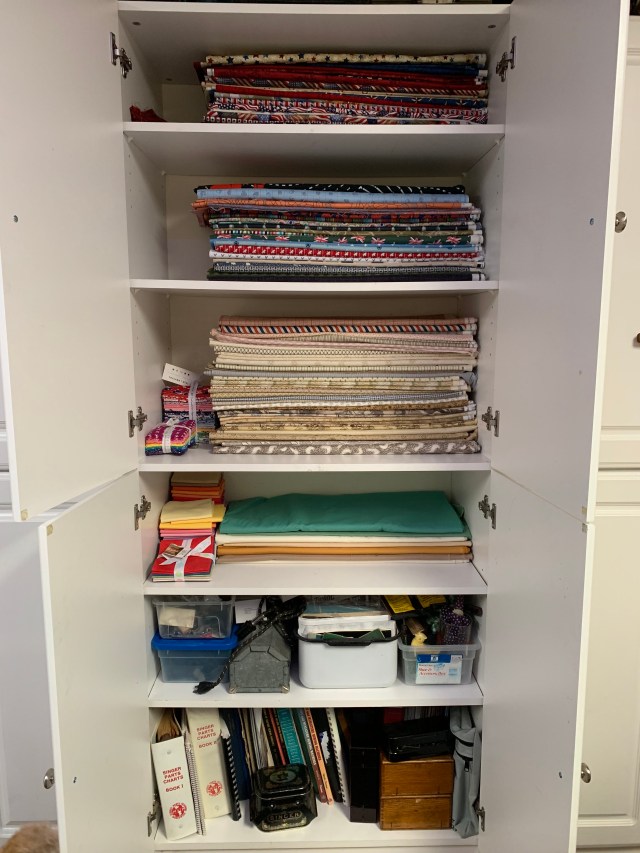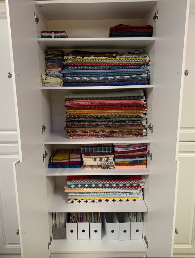 In January each year, I try to do a deep clean in the sewing room. I accidentally started early this year. I was looking for border options for the Dutch Hexies quilt and decided to straighten up my shelves holding yardage.