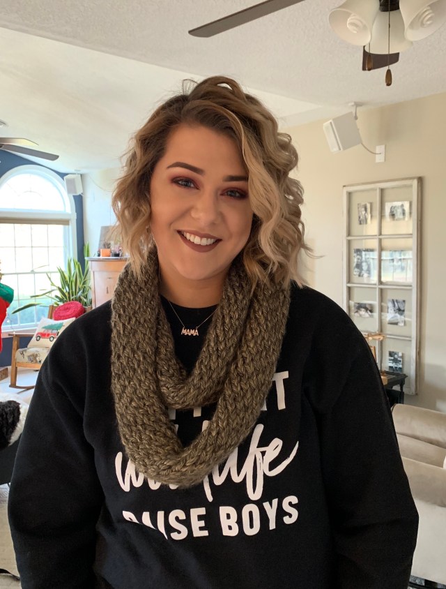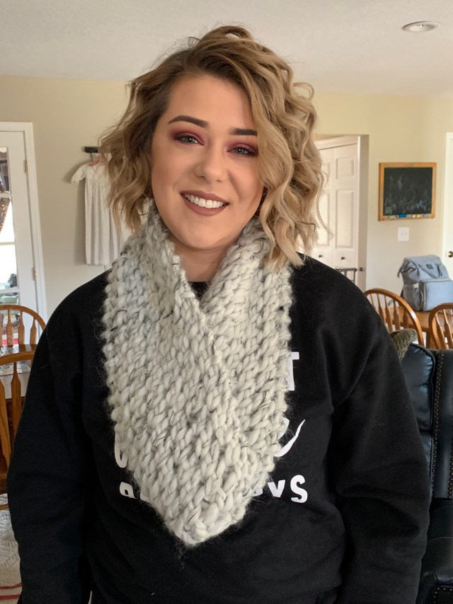 Daughter #1 is my beautiful model. The darker scarf was made for her, the lighter one was gifted to Daughter #3. Daughter #2 lives in Arizona so a bulky scarf is not needed. I did send her a hand knitted dishcloth! I’ve also started another dishcloth and hope to finish that today.