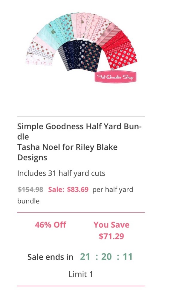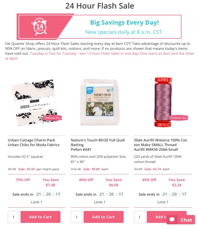 Hi Katy! Moving the Flash sale start time is fabulous news, I think. I get their emails and invertible it is just before 10am when I get around to opening it. I never, EVER remember to go back to their website 20 minutes later. Also, I usually read your posts via WP Reader but I’ll start going directly to your website so that I can click on your links. Especially when checking on the FQS. Happy New Year. ~smile~ Roseanne P.S. Some websites have SO many ads that I don’t frequent them at all. The one that springs to mind is Bonnie Hunter’s – she may have fabulous QALs but I can’t stand all the ads in the middle of reading a post. See what works for you! I completely understand needing to supplement the cost of blogging!