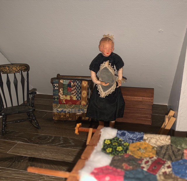 And I finally have a maid! Of course, she snuck away to put a few stitches in the quilt on the frame.