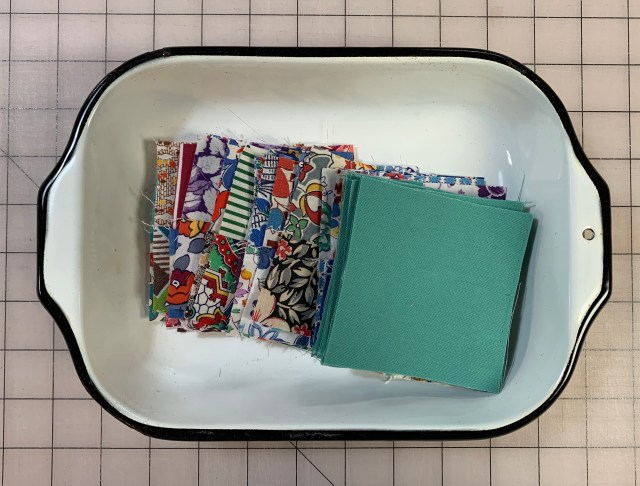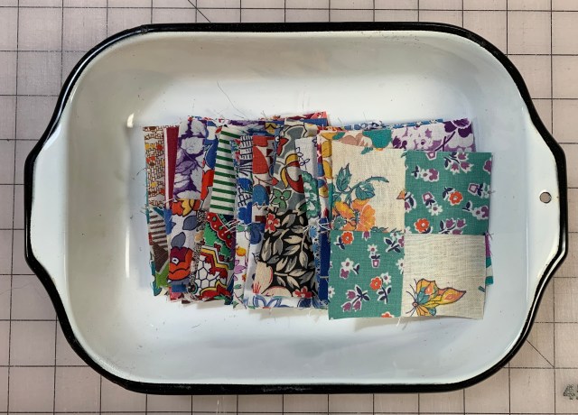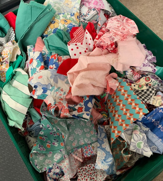 I saw a little quilt on Pinterest and decided I had to make it. So I pulled out this bin of vintage scraps.