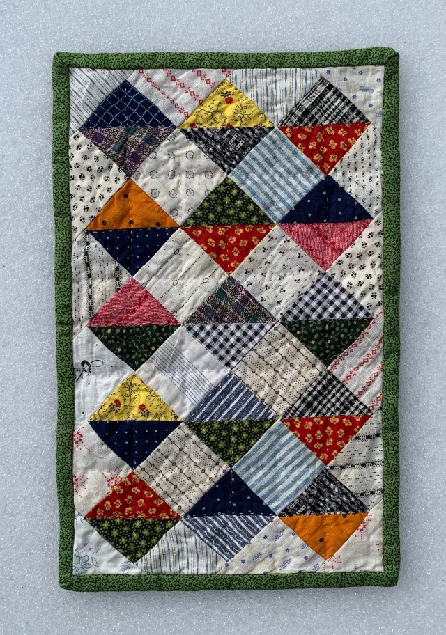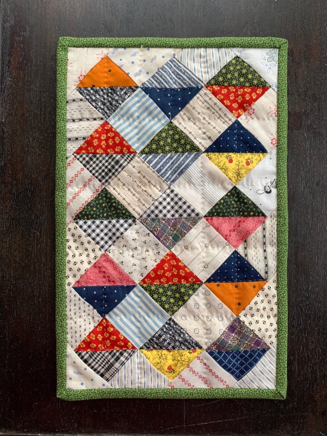 This was pieced in an afternoon and quilted that same night. All the scraps used in the top are vintage. The backing is unbleached muslin. The binding fabric is new. It finished up at about 7 by 11 inches.
