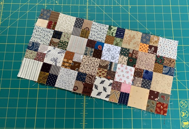I need to make just a couple more half blocks yet. Then I will add a narrow border so this will end up around 100 inches square.