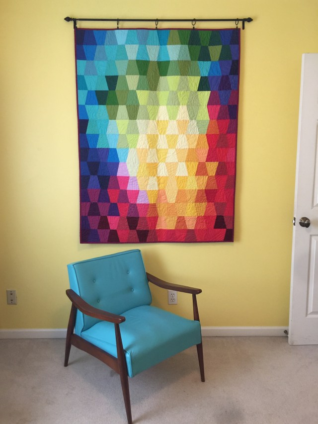 Love the tumbler!!! What size are they, and did you have a pattern for the color layout? Kona fabrics? Also, I love the way you have it hung on the wall. Could you explain how you did this? Sorry for all the questions, this quilt is just stunning!!! You have inspired me to make one myself.