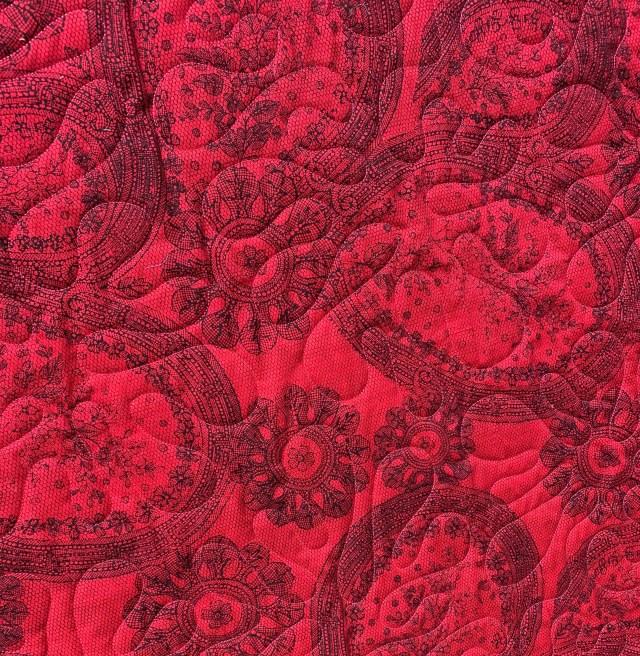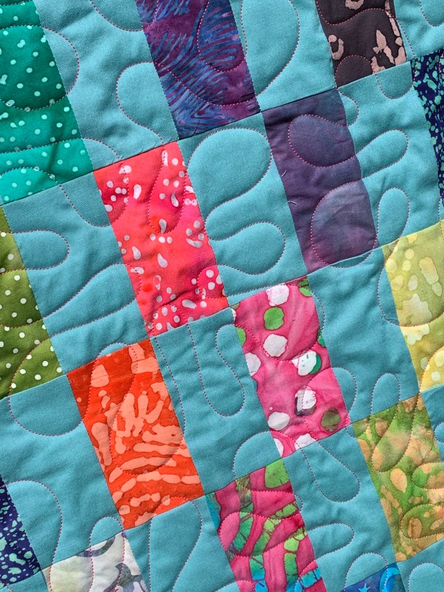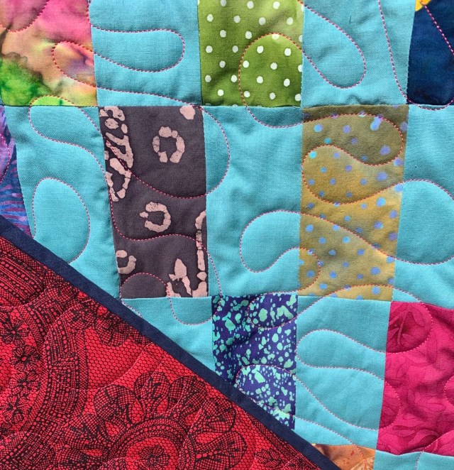 Very pretty! I love the hot pink backing and the pink quilting thread, and the loopy curves of the panto you selected complement the straight geometric lines of the piecing nicely to soften.