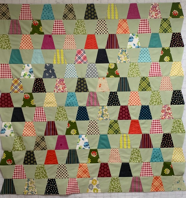 This is decades old. All appliqué is done by top stitching. This has made the strips a bit wonky and wavy. But that green I used in the tumblers is inspiring me to finish this.